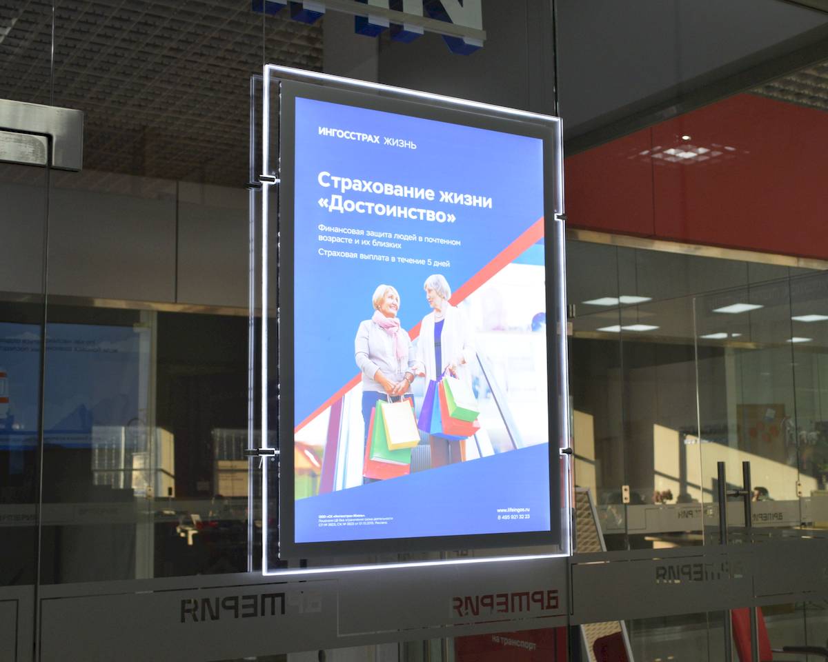 Это серия премиальных световых панелей на стену. Прозрачный корпус из акрилового стекла в сочетании с контражурной подсветкой создает изящный световой ореол вокруг рекламного изображения. Ощущение изысканности создает также и минимальная толщина конструкции.