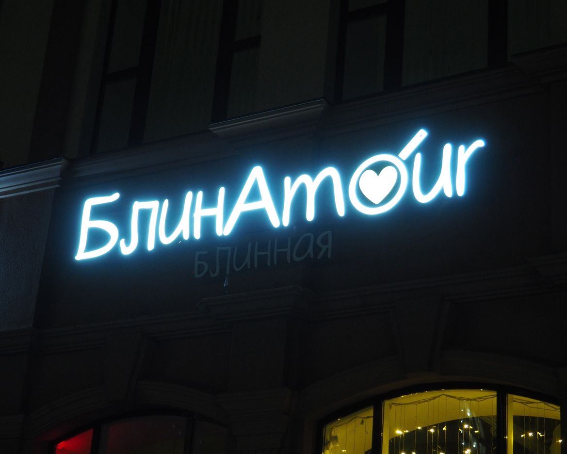 Не стоит забывать про такой тип букв, как «псевдообъемные». Это плоские буквы, выполненные из различных материалов: композит, пластик, оргстекло. Основной способ засветки — контражур, о котором мы говорили чуть выше. Это оригинальное решение для компаний с небольшим бюджетом. Несмотря на доступную стоимость, подобного рода буквы имеют длительный срок службы, а благодаря идеям дизайнера и грамотному использованию материалов являются достойной альтернативой объемным буквам.