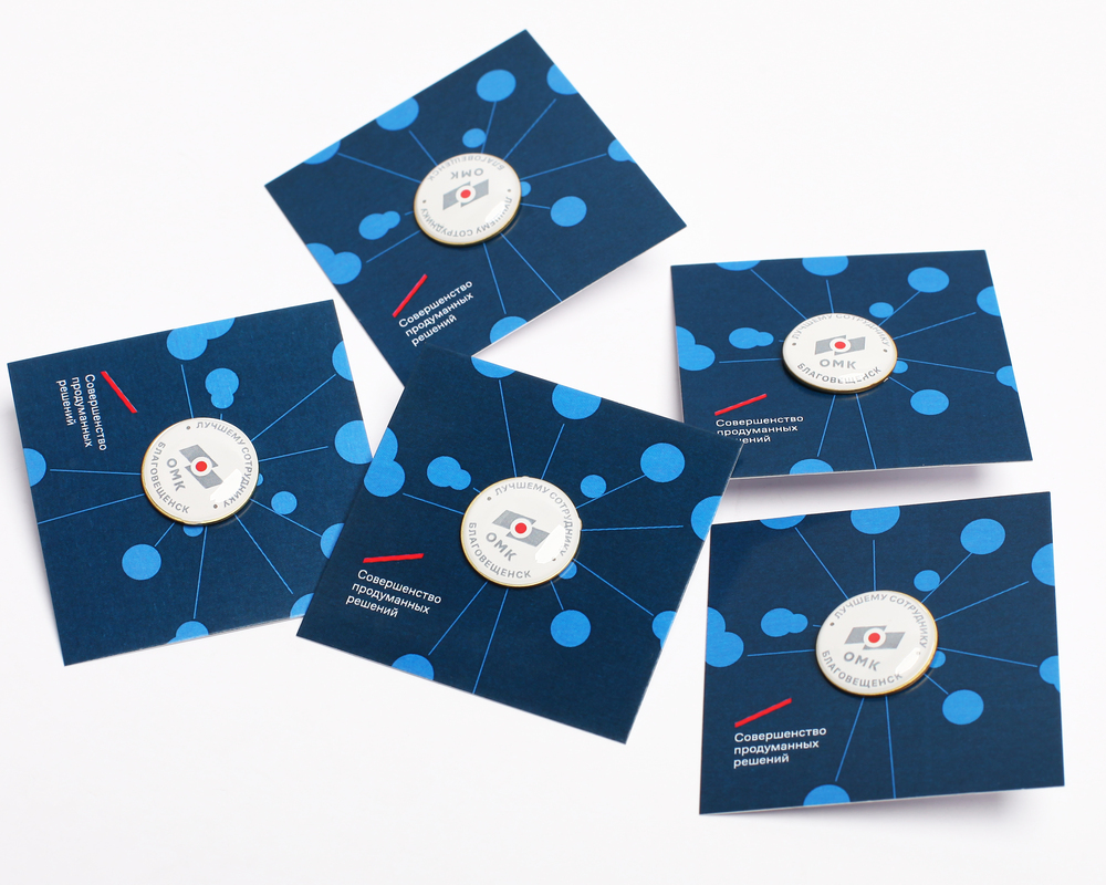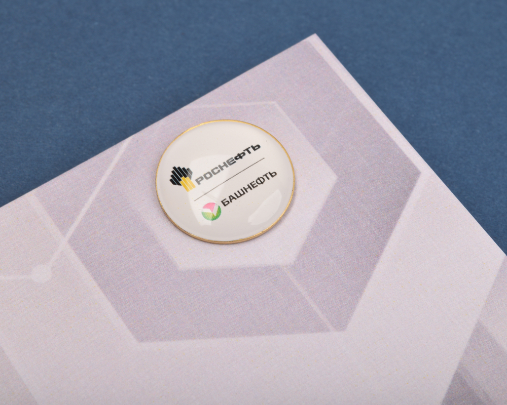 Первый этап – это разработка дизайна. Именно на этом этапе важно исключить мелкие детали, сложный шрифт и все то, что делать восприятие информации малодоступной. Мы рекомендуем использовать минимум информации и только самое важное. Например, логотип, название компании, наименование должности, значимые даты или айдентику бренда. То есть главный акцент и ноль лишней информации. Правильно выбирайте размер и форму изделия. Помните, что металлическое основание не самое легкое, добавьте сюда вес смолы и оцените объективно полученное изделие. Огромная «блямба» будет иметь вес, тянуть одежду и как правило не будет отличаться эстетикой. В итоге получится медаль, а это уже совсем другая история. И обратите внимание на цвет основания. Это может быть «золото» или «серебро». Учитывайте цветовую гамму изображения и сочетание с основой. «Серебро» весьма универсальный цвет и сочетается с большинством цветовых решений. Проявите особое внимание при выборе основы «золото». Поверьте нашему многолетнему опыту, если вы хотите, чтобы изделием пользовались, делайте его изначально красивым с прицелом на перспективу.